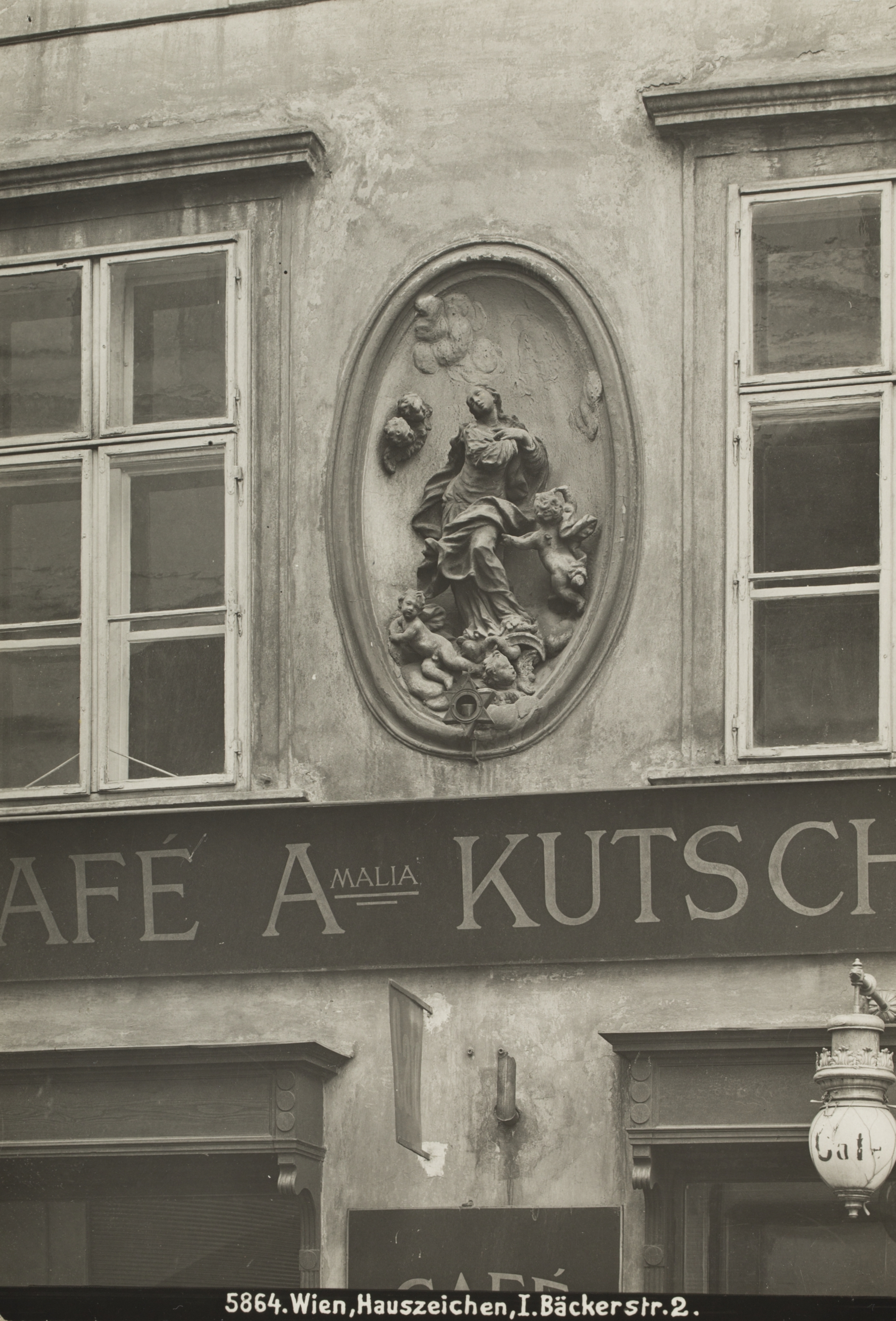 Bruno Reiffenstein (Fotograf), 1., Bäckerstraße 2 - Zeltschneiderisches Haus - Hauszeichen Maria Immaculata, um 1905, Wien Museum Inv.-Nr. 57150/7, CC0 (https://sammlung.wienmuseum.at/objekt/557353/)