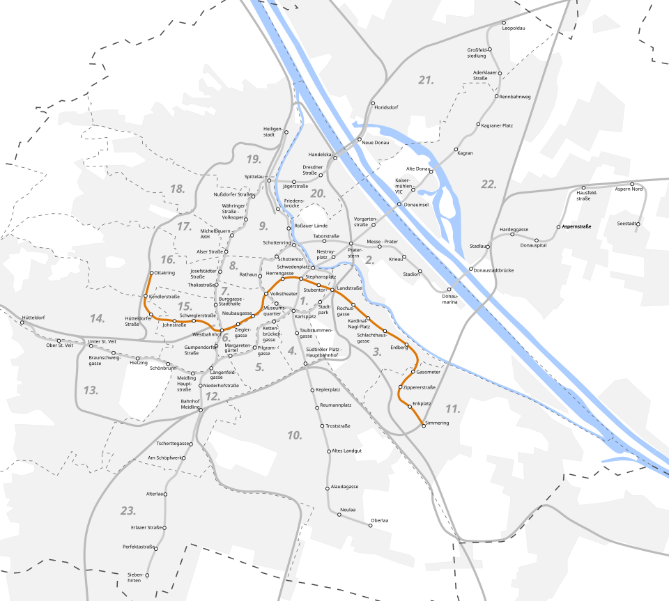 Deutsch: Die relevante U-Bahn-Linie ist farblich hervorgehoben, alle anderen sind grau dargestellt. Außerdem zeigt die Karte das S-Bahn-Netz (ohne Stationen) sowie Wasserflächen und die Stadtgrenze