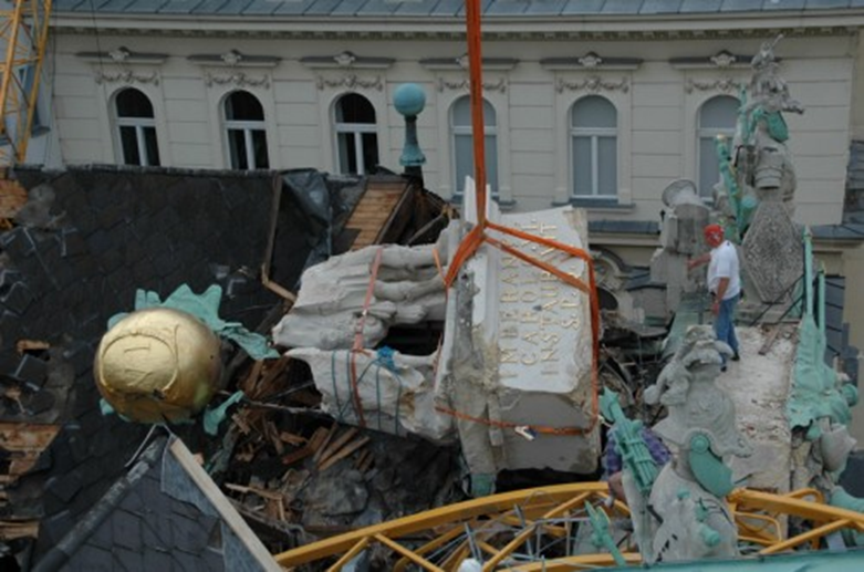 Im Jahr 2007 wurde das Gebäude einer Renovierung unterzogen, dazu wurde ein 55 Meter hoher Kran aufgestellt. Für den 21.6.2007 wurden einige Sturmwarnungen bekanntgegeben. Um 16:58 Uhr stieß eine Windböe mit 120 kmh Geschwindigkeit in den Kran, brachte ihn zum Wanken und schließlich zum Umkippen. Der Mast des Krans krachte in das Dach des Hauses Nummer 10, wobei der Dachaufbau mit mehreren historischen Figuren und der dritte Stock im Bereich der Kleiderkammer der Feuerwehr zerstört wurde, die 14 Tonnen schweren Gewichte stürzten in den Innenhof, in dem sich eine Tankstelle befand und die den Tank der Zapfsäule aufrissen. Ein 1.500 Liter-Betonkübel, der gerade am Kran gehangen war, verfing sich in 8 Meter Höhe in der Ecke des Hauses. Bei dem Umsturz wurde auch die Hauptwasserleitung gekappt, was dazu führte, dass der Innenhof rasch unter Wasser stand. Da die Feuerwehr in unmittelbarer Nähe ist und die Feuerwehrmänner mit Schließen der Fenster beschäftigt waren, waren sie Augenzeugen der Geschehnisse und waren sofort am Einsatzort.