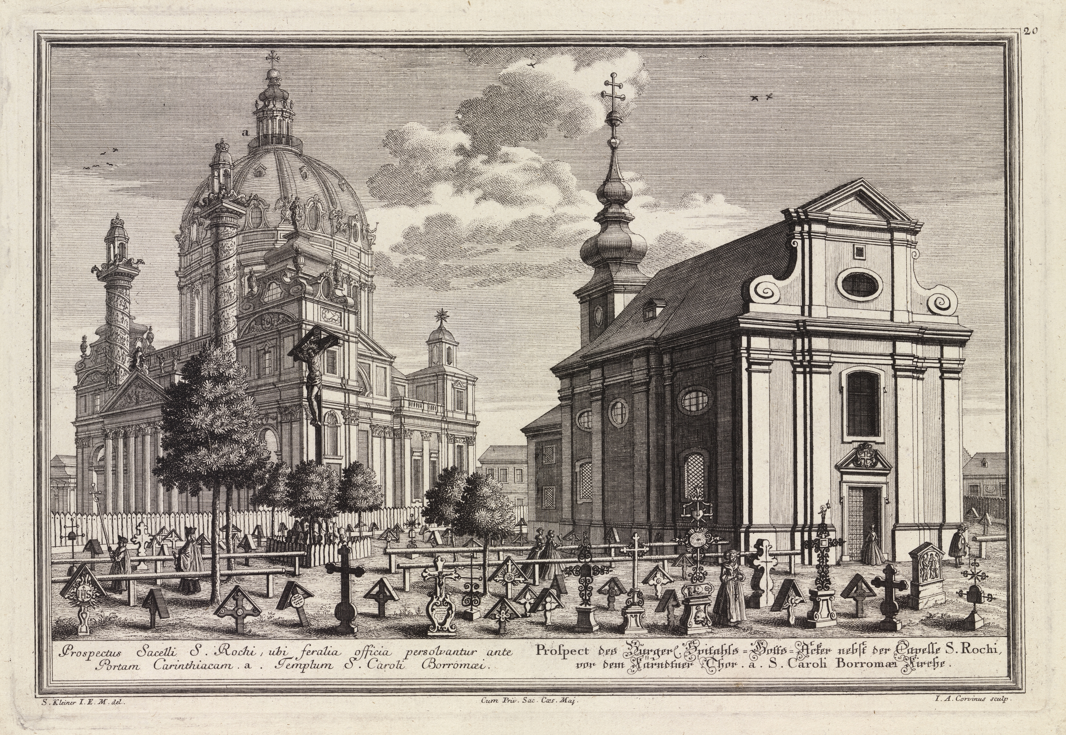 - ↑ Salomon Kleiner (Zeichner), Johann August Corvinus (Kupferstecher), Johann Andreas d. Ä. Pfeffel (Verleger), "Prospect des Bürgerl. Spitahls-Gotts-Acker nebst der Capelle S. Rochi" (Karlskirche und Bürgerspital-Gottesacker mit der Augustinkapelle), aus: Wahrhafte und genaue Abbildung (...), 4. Teil, Abb. 20, 1737, Wien Museum Inv.-Nr. 31142, CC0 (https://sammlung.wienmuseum.at/objekt/59347/)