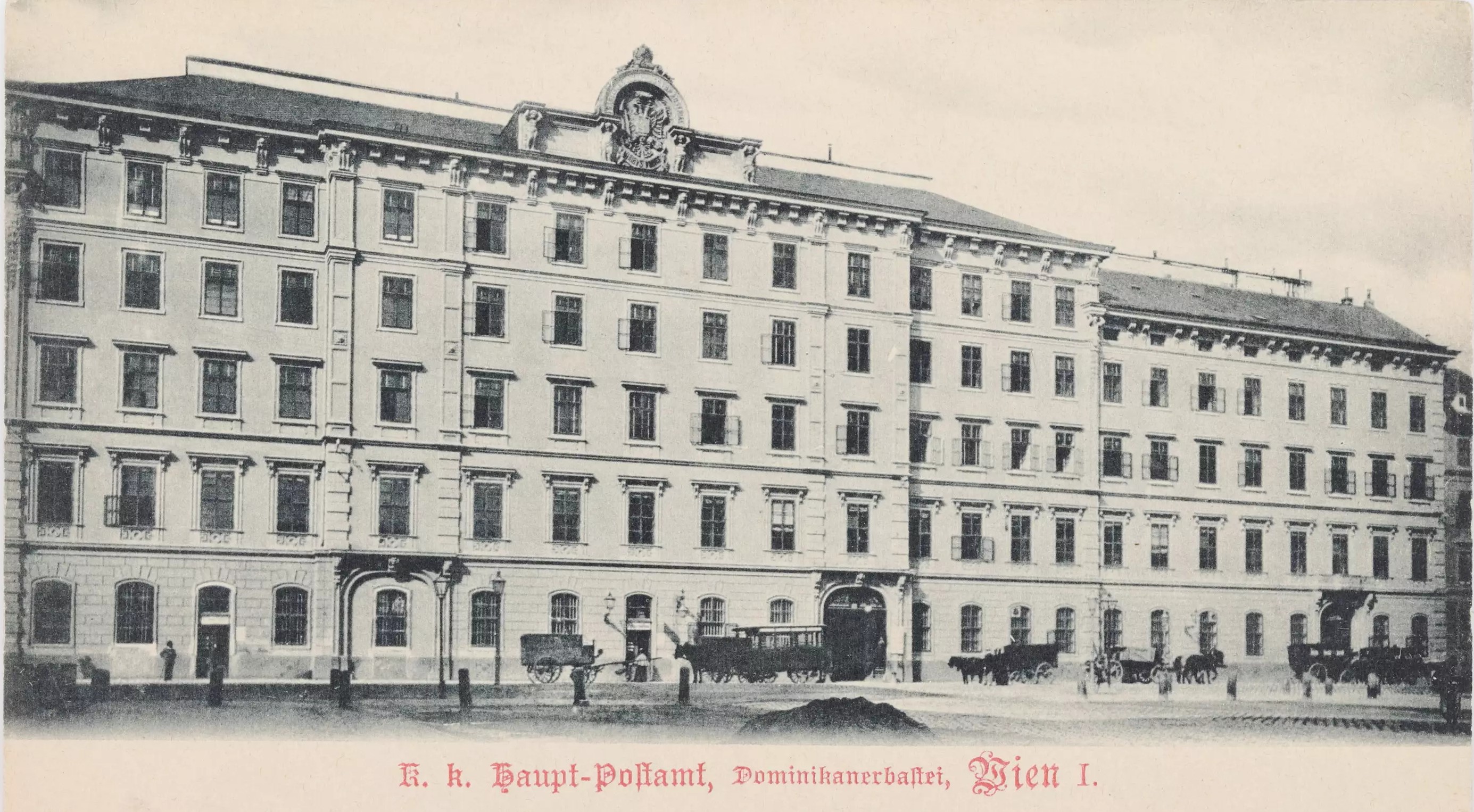 - ↑ Carl (Karl) Ledermann jun. (Hersteller), K. k. Haupt-Postamt, Dominikanerbastei, Wien I., um 1898, Wien Museum Inv.-Nr. 182823, CC0 (https://sammlung.wienmuseum.at/objekt/841062/)