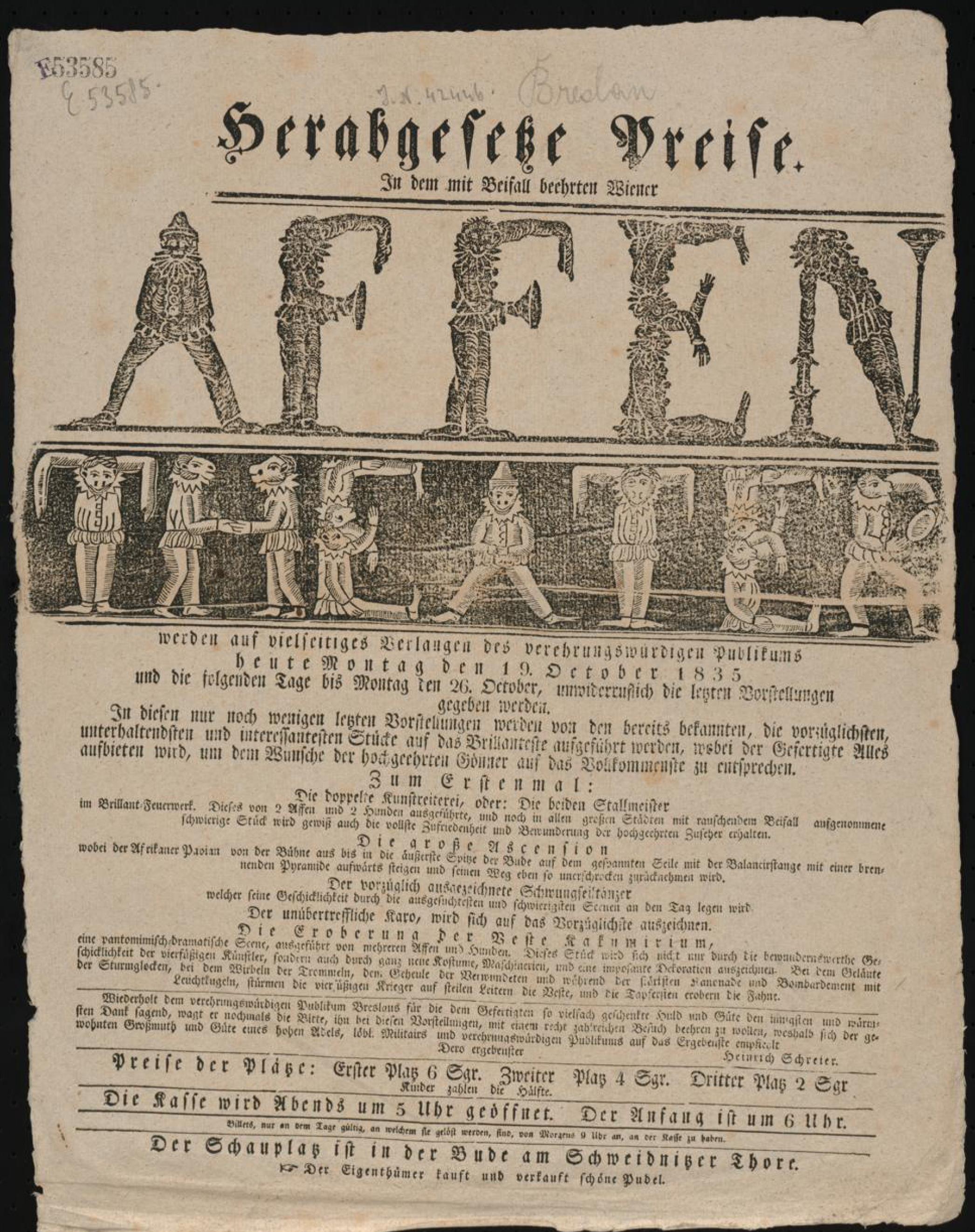 Die Schaustellerfamilie Advinent eröffnete 1829 im Prater ein Affentheater. Es gab bis 1823 bereits eines, in dem ritten Affen auf Hunden, diesmal wurden Ponys genutzt. [3]
