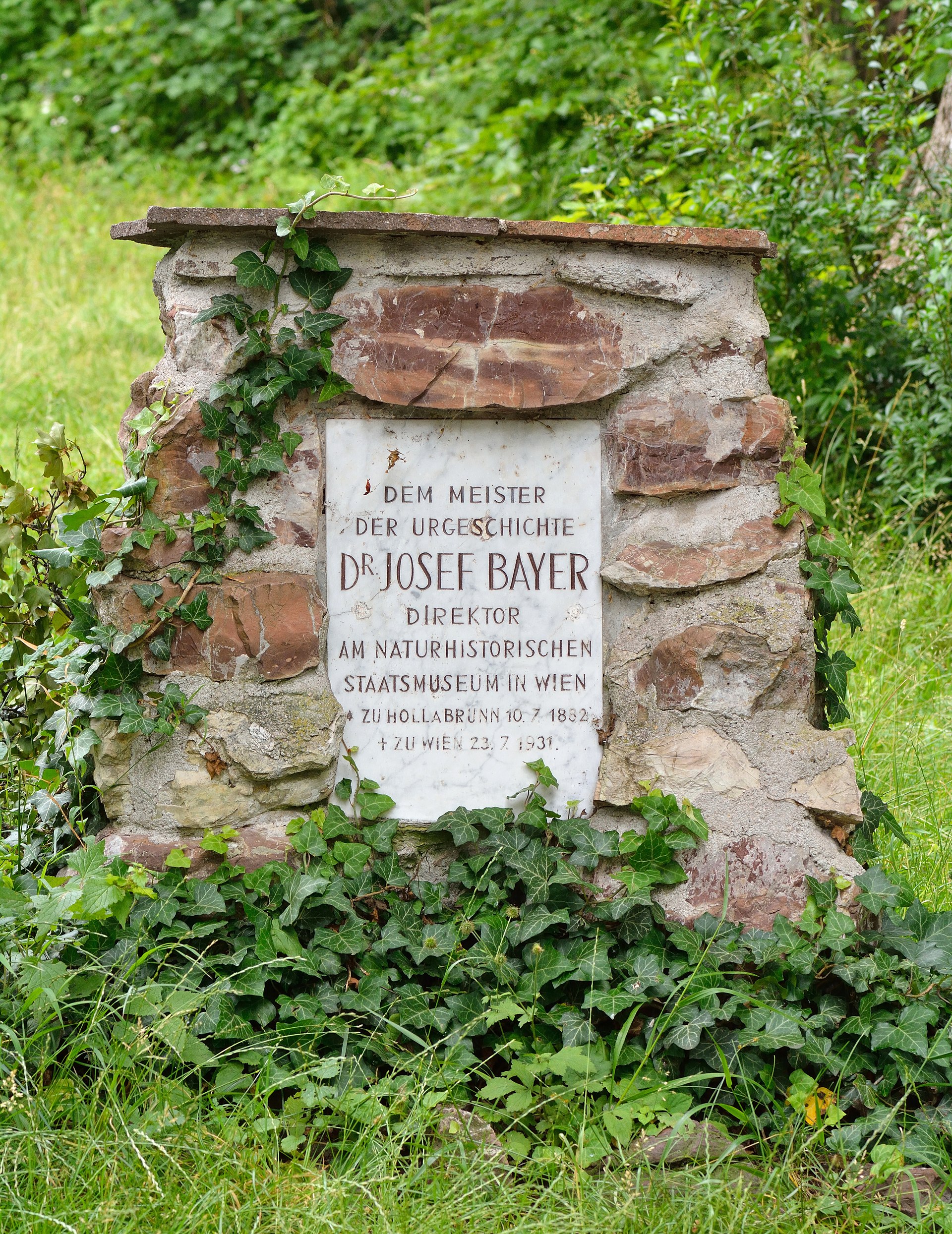 Deutsch: Gedenkstein für den Urgeschichtler Josef Bayer neben der Schießstätte im Maurer Wald in Wien-Liesing.