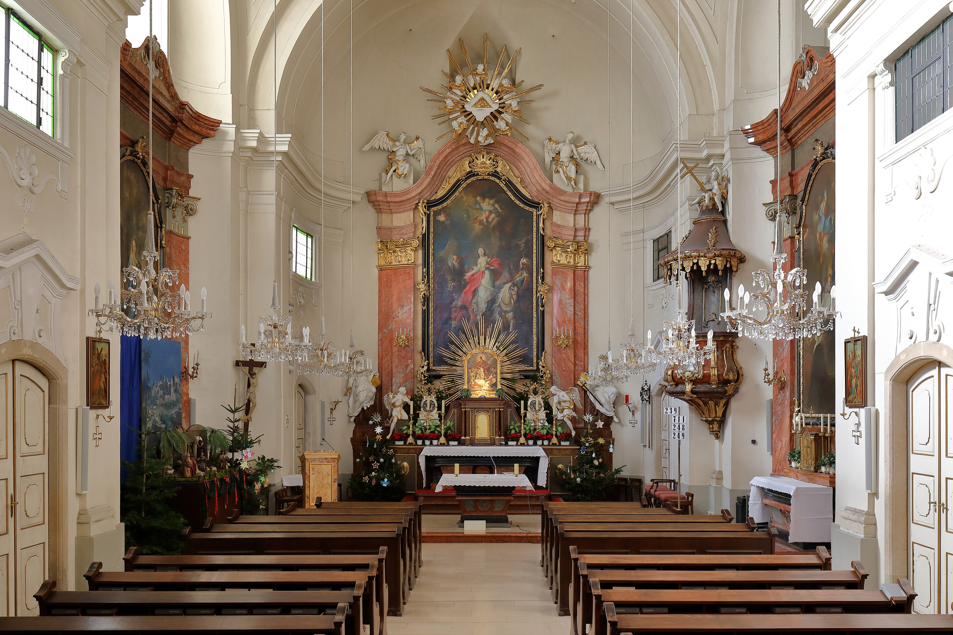 Deutsch: Innenansicht der röm.-kath. Filialkirche St. Thekla, auch Piaristenkirche bzw. Theklakirche bezeichnet, im 4. Wiener Bezirk Wieden. Die Kirche wurde ab ca. 1754 nach Plänen von Matthias Gerl errichtet und am 26. September 1756 geweiht. Als Kirchenpatronin fungierte die hl. Thekla. Das Hochaltarbild der hl. Thekla ist ein Werk von Felix Ivo Leicher, der auch die zwei Seitenaltarbilder (hl.Josef von Calasanz und Maria Immaculata) malte.