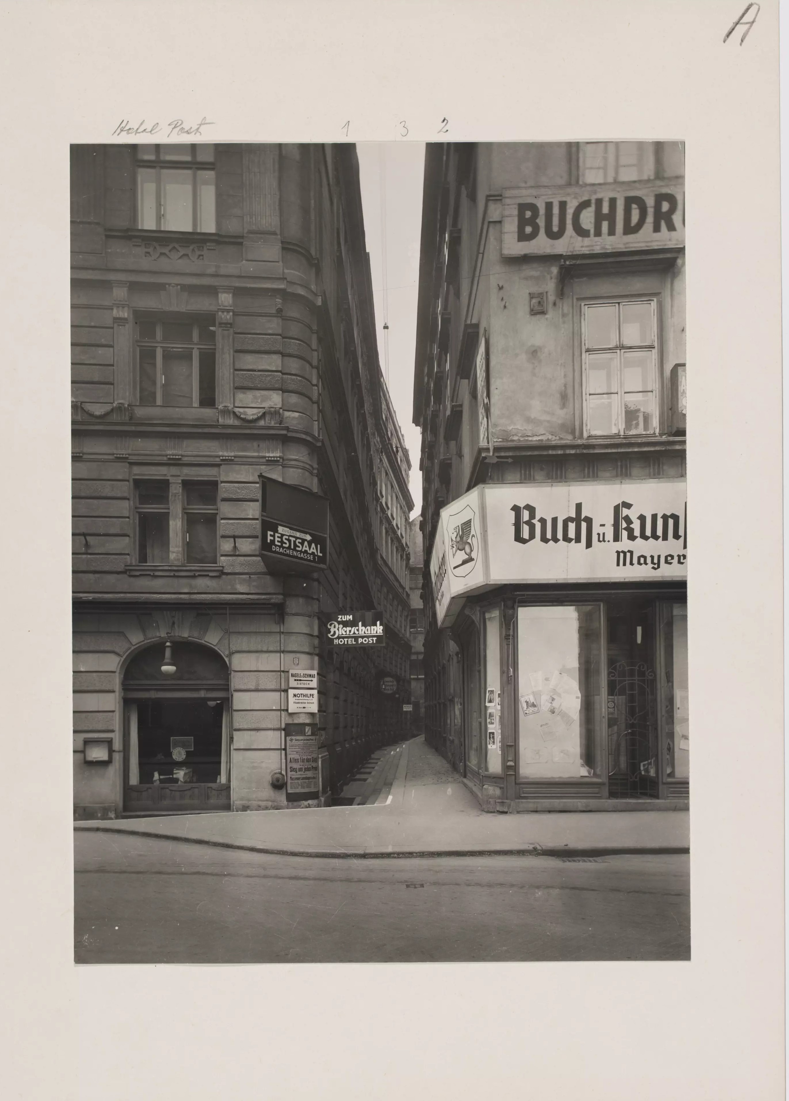 - ↑ Bruno Reiffenstein (Fotograf), 1., Drachengasse 1, 2 u. 3 - Ecke Fleischmarkt, 1942, Wien Museum Inv.-Nr. 79000/3319, CC0 (https://sammlung.wienmuseum.at/objekt/146484/)