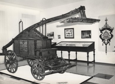 - 1817: Brachte das Feuerlöschpatent einen großen Fortschritt, vor allem auf baupolizeilichem Gebiet.Einführung der sogenannten "Melzelschen Erstickungswehr", dem ersten Atemschutzgerät das je einer Feuerwehr zur Verfügung stand. Es bestand aus einer Rauchhaube, Luftzuführungsschläuchen und einer Luftpumpe.4 Feuerknechte, 4 Feuerknechtsgehilfen, 20 Feuertaglöhner, 3 Bereitschaftskutscher, 5 Reservekutscher und die Handwerksgesellen, je 4 von allen Baugewerben; 3 Paar Bereitschaftspferde.