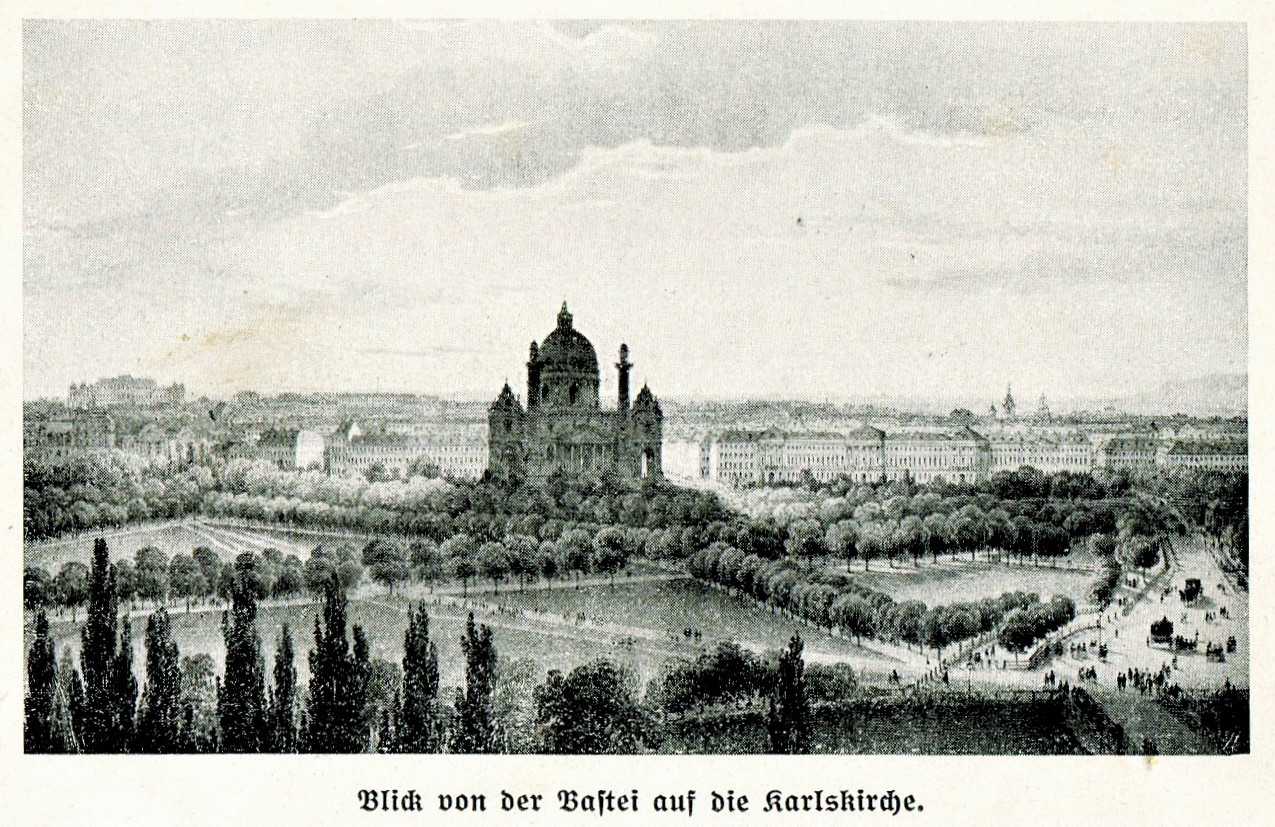 Auf dem Glacis sieht man die Brücke über die Wien, welche zur Vorstadt Wieden, auf die Straße nach Baden führt. Rechts steht das große Starhembergische Freihaus , links das Polytechnische Institut und die Karlskirche. Über das Starhembergische Freihaus hin sieht man die Gebirge des Wienerwalds und an heiteren Tagen erblickt man den Schneeberg in weiter Ferne empor ragen. In der Vorstadt steht links von der Karlskirche das Sommerpalais des Fürsten Schwarzenberg, darüber ragt das Belvedere empor, und hinter diesem rechts sieht man die Rauchfänge im Bahnhof von der Raaber Eisenbahn. Links vom Belvedere ist Kirche und Kloster der Salesianerinnen, neben dem Schwarzenbergischen Palais steht vorne die neue Kaserne (für Infanterie und das Beschal-Department). Das Palais mit den großen Saalfenstern ist Eigentum des Erzherzogs Maximilian. Im Stadtgraben steht ein Militärmagazin und ein kleiner Garten des Erzherzogs Karl, der in Verbindung mit dem oberen ist, welcher den ganzen nun folgenden Ravelin einnimmt. Diesem gegenüber springt das Palais Kolowrat vor. [3]