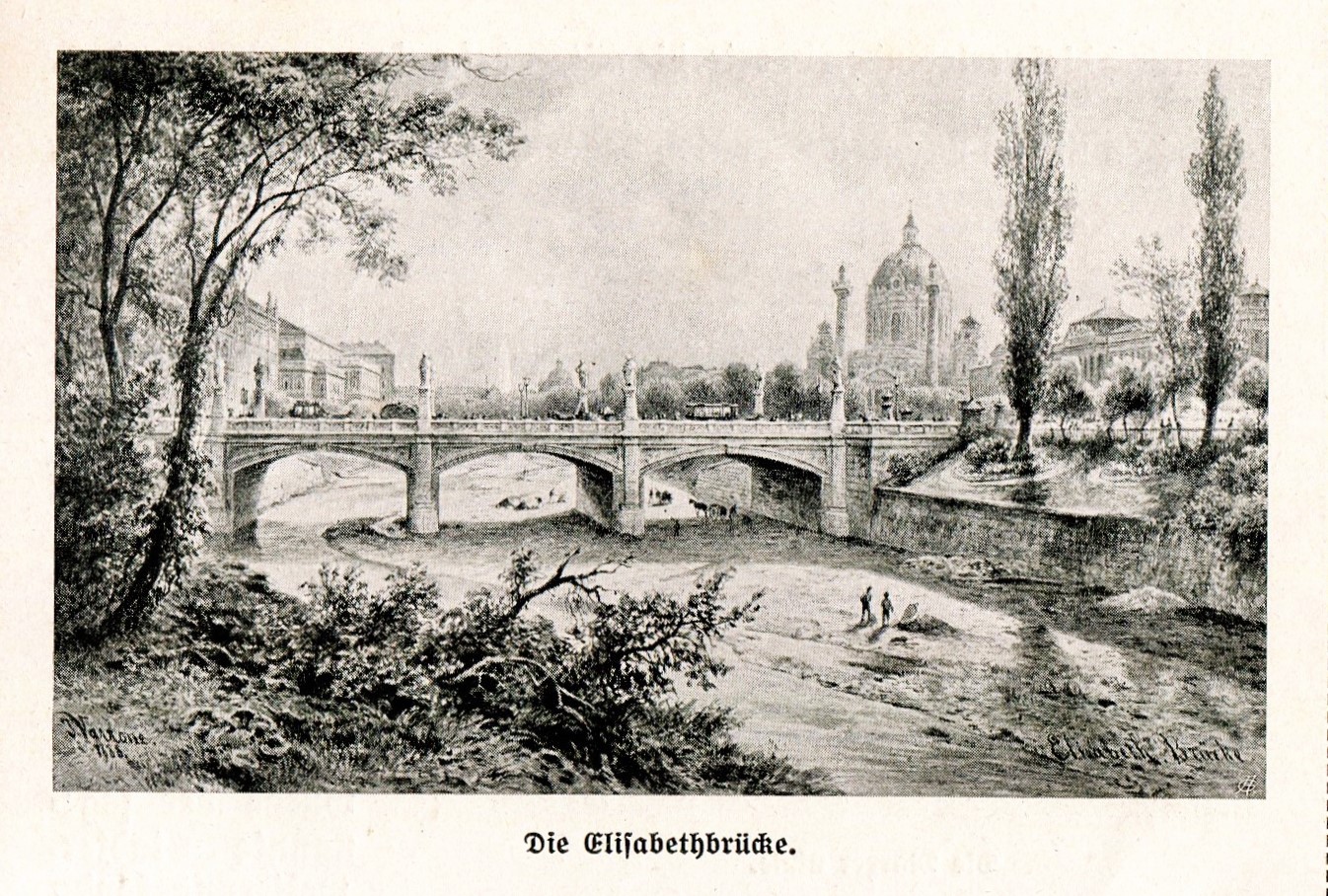 Die Brücke ist die Elisabethbrücke, die zu dieser Zeit noch den offenen Wienfluss überspannte, er wurde 1895 eingewölbt, die Brücke wurde abgebrochen. Das Starhembergische Freihaus wurde in Etappen zwischen 1858 und 1970 abgebrochen, es stand im Bereich der heutigen Wiedner Hauptstraße 10, Margaretenstraße 10-16 und Operngasse 25 im vierten Bezirk. Das ebenfalls erwähnte Polytechnische Institut ist heute die Technische Universität, Karlsplatz 12-13, neben der immer noch die Karlskirche zu sehen ist. Links davon, am Rennweg 2, steht auch das Schwarzenbergpalais noch.