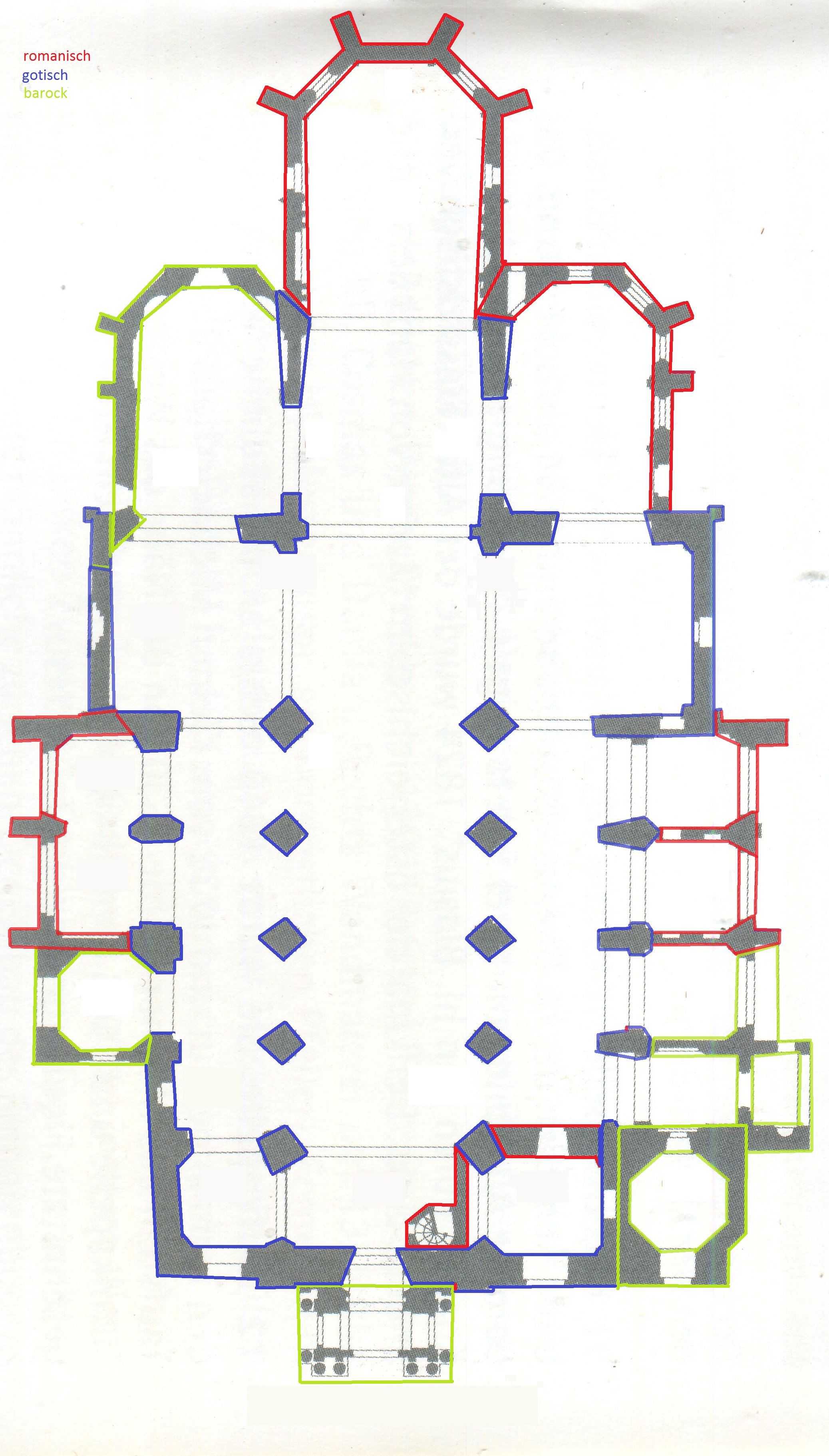 Erst baustoffliche Untersuchungen des Fundaments bewiesen, dass die Substanz deutlich älter als die Kirche selbst ist, die Vermutungen erhärteten sich in den 1980er Jahren: nämlich bei Entdeckung des Bogens des Westportals, der Freilegung des Nordportals und der „porta laterale“ hinter dem Allerseelen-Altar. Der Baubeginn der spätromanischen und frühgotischen Kirche musste tatsächlich im Jahr 1220 gewesen sein. Belegt wurde das spätromanische Baualter schließlich durch die Erkenntnis, dass alle Steine der Friese das gleiche Steinmetzzeichen trugen.
