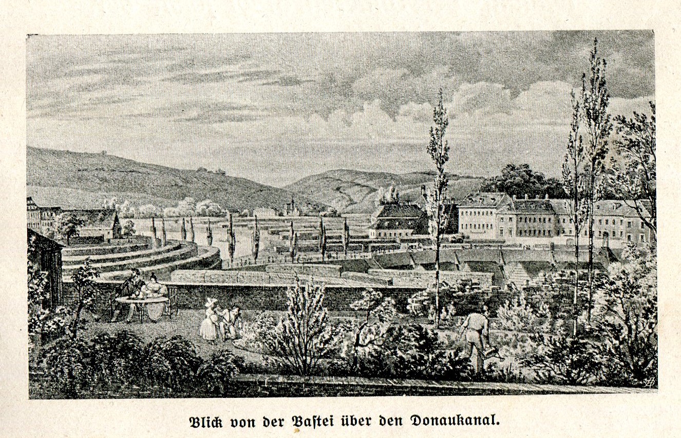 Auf dem nächstfolgenden Ravelin erblickt man den Donaukanal. Es ist ein malerischer Standpunkt: Links hat man das Kahlengebirge, rechts die Bäume des Praters zum Hintergrunde, vor sich am anderen Ufer die Leopoldstadt; die Ferdinandbrücke führt vom Rotenturm-Tore hinüber. Von ihr führt die Taborstraße gerade fort (nördlich) zum Tabor, der Linie gegen Mähren und Böhmen, rechts aber sieht man zum Teil in die Jägerzeile hinein, durch welche die berühmte Praterfahrt geht. Der Donau abwärts sind die Fischerkähne, weiterhin landen die Getreideschiffe und man sieht die großen Kornspeicher. Unterhalb diesem steht die Franzensbrücke. Die Bastei wird weiterhin am niedrigsten. Die Vorstadt diesseits heißt unter den Weißgerbern und Erdberg. Ehe man zum Rotenturm-Tore kommt sieht man in der Stadt die stark ansteigende Laurenzergasse hinauf, deren linke Seite von einem großen Gebäude (Lorenzerhof) gebildet wird, in welchem die Staatsbuchhaltungen und noch mehr andere Büros sich befinden. [14]