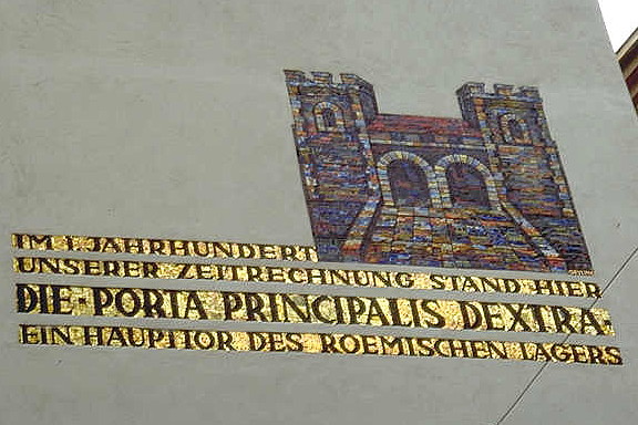 Das relativ neu erbaute Haus entstand 1934 nach Entwürfen von Hermann Aichinger und Heinrich Schmid Junior im Auftrag der Allgemeinen Baugesellschaft Porr. Da man etwa hier die "porta principalis dextra" vermutet, die den Ausgang aus dem römischen Lager darstellte, ist an der Fassade eine Erinnerung daran angebracht.