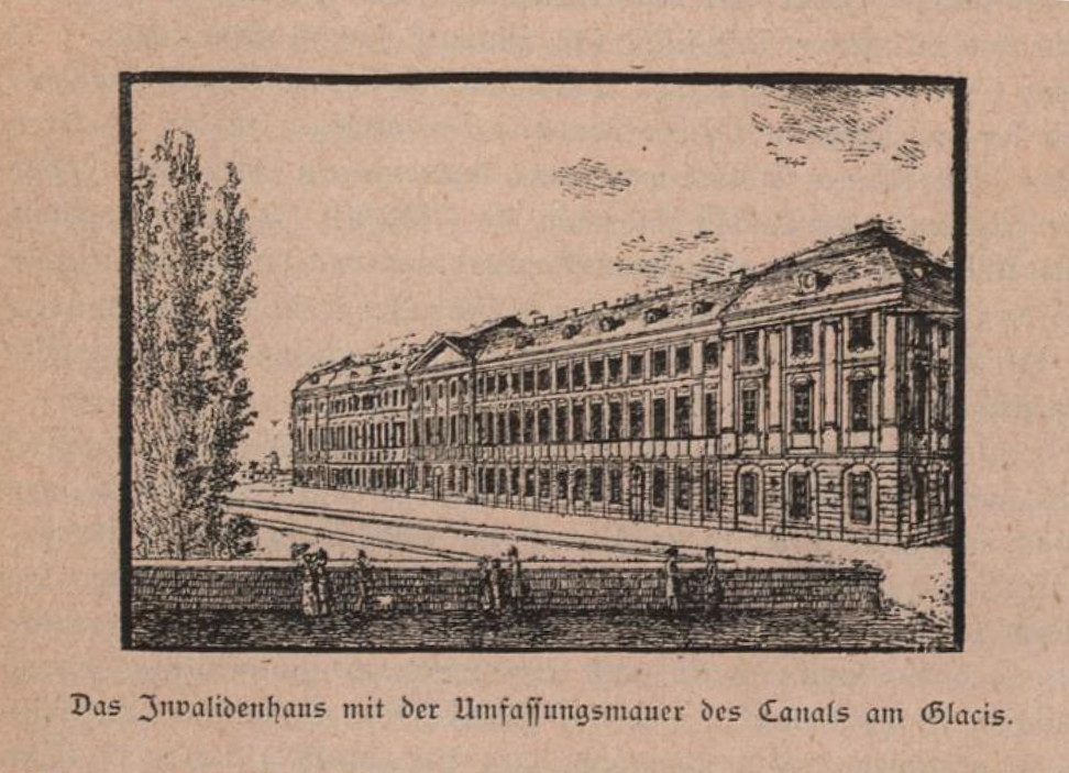 Geht man auf der Kurtine des Walls weiter fort, so kömmt man an einem Hause vorbei, welches ein Stockwerk hoch, etwas weiter zurück in der Reihe steht, es ist die orientalische Akademie. Gleich darauf ist man am Stubentor, sieht in der Stadt die Wollzeile hinauf, und außen auf die große Steinbrücke über die Wien, deren dammartige Verlängerung beiderseits von schönen Pappeln eingefasst ist. Dort ist die Hauptstraße der Vorstadt Landstraße, welche zur Linie (Barriere) von St. Marx und Ungarn führt. Rechts von den Pappeln steht das stattliche Münzgebäude, dicht neben diesem links zieht sich der Neustädter Kanal herab, und an ihm befindet sich, von den Bäumen versteckt, die Stückbohrerei. Links von den Pappeln ist das Invalidenhaus, vor ihm das Kanalbassin mit einem Holzmarkte.[2]
