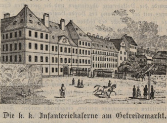 Ehemals befand sich auf dem Areal die k.k. Infanterie-Kaserne, sie erstreckte sich vom heutigen Haus Rahlgasse 1 über die Häuser Gumpendorferstraße 6 und Gumpendorferstraße 8 bis zur heutigen Königsklostergasse 4 (damals "Bettler-Stiege"). Sie befand sich damit über der heutigen Theobaldgasse (Häuserblock 1 bis 7 und 2 bis 12)