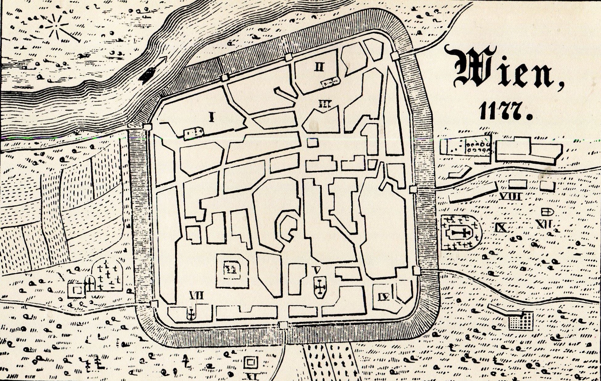 Dass Wien mit den römischen Mauern nicht das Auslangen fand, war offensichtlich damals schon klar, denn Heinrich siedelte und förderte außerhalb der Befestigung bereits weitere Bewohner: Die iroschottischen Mönche, die er geholt hatte, erhielten das Gebiet bei der heutigen Freyung, um die Schottenkirche mit Kloster zu erbauen, und auch im Bereich des 1147 geweihten Stephansdoms, dessen Grundstein 1137 gelegt wurde, siedelten sich nun Händler an (VIII und IX).