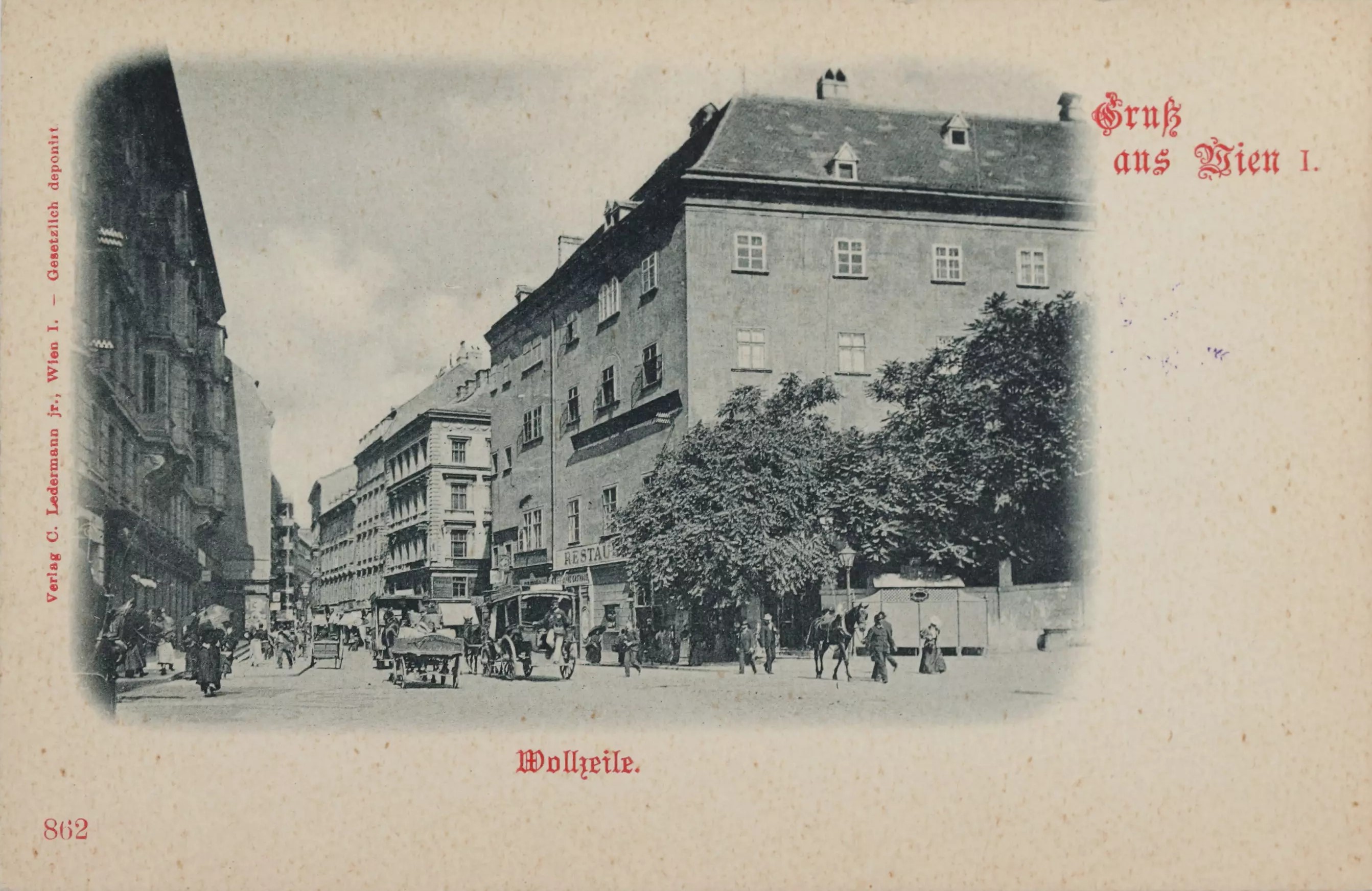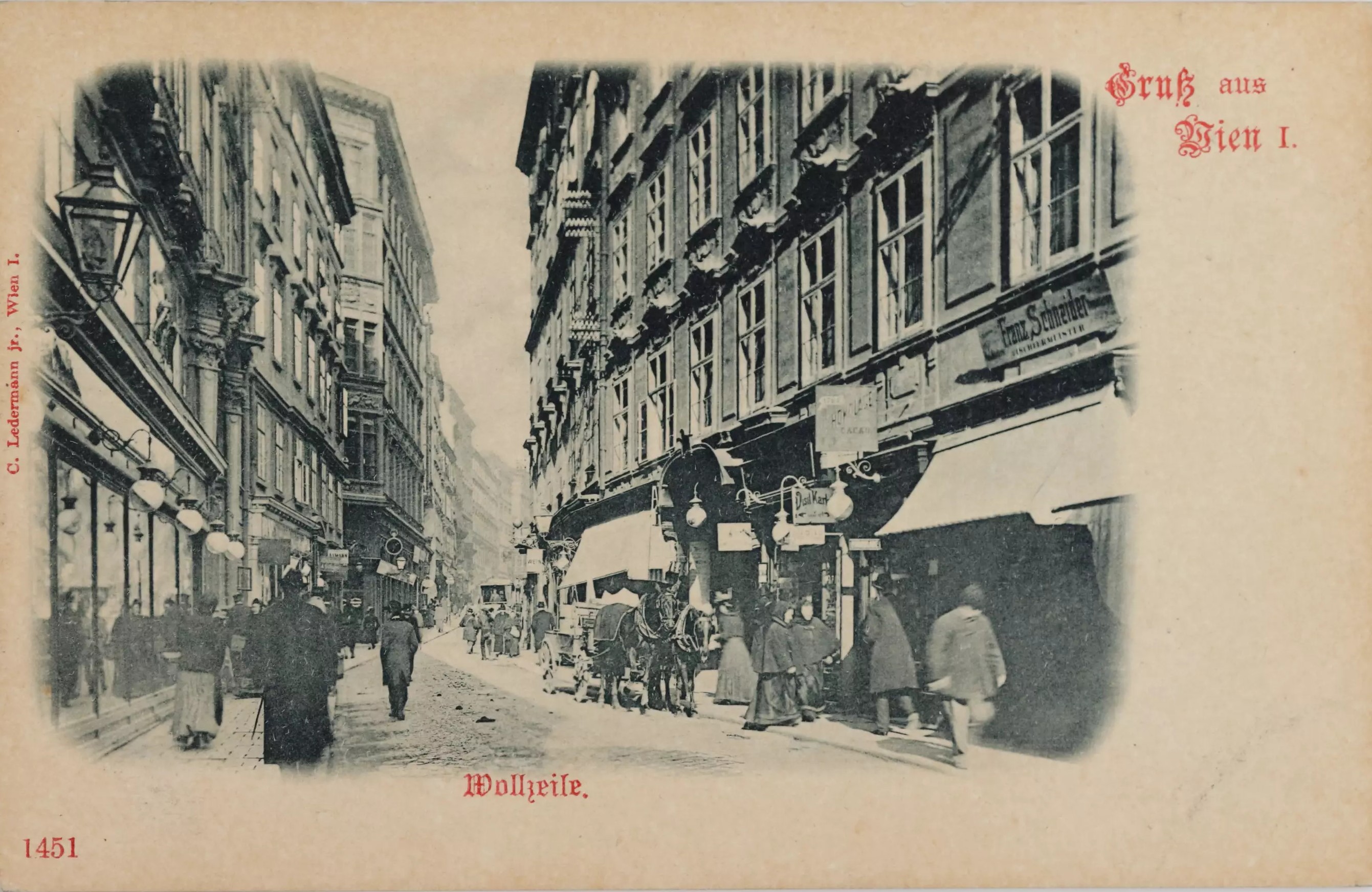 - ↑ Carl (Karl) Ledermann jun. (Hersteller), 1., Wollzeile - allg., Ansichtskarte, um 1898, Wien Museum Inv.-Nr. 183270, CC0 (https://sammlung.wienmuseum.at/objekt/355393/)